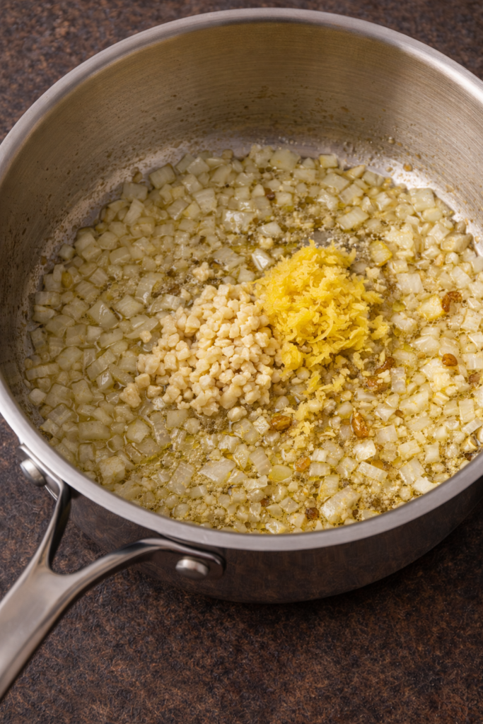 Numa panela ou frigideira funda, aqueça o azeite e refogue a cebola até ficar translúcida. Adicione o alho e o gengibre ralado e deixe cozinhar por mais 1 minuto sem queimar.