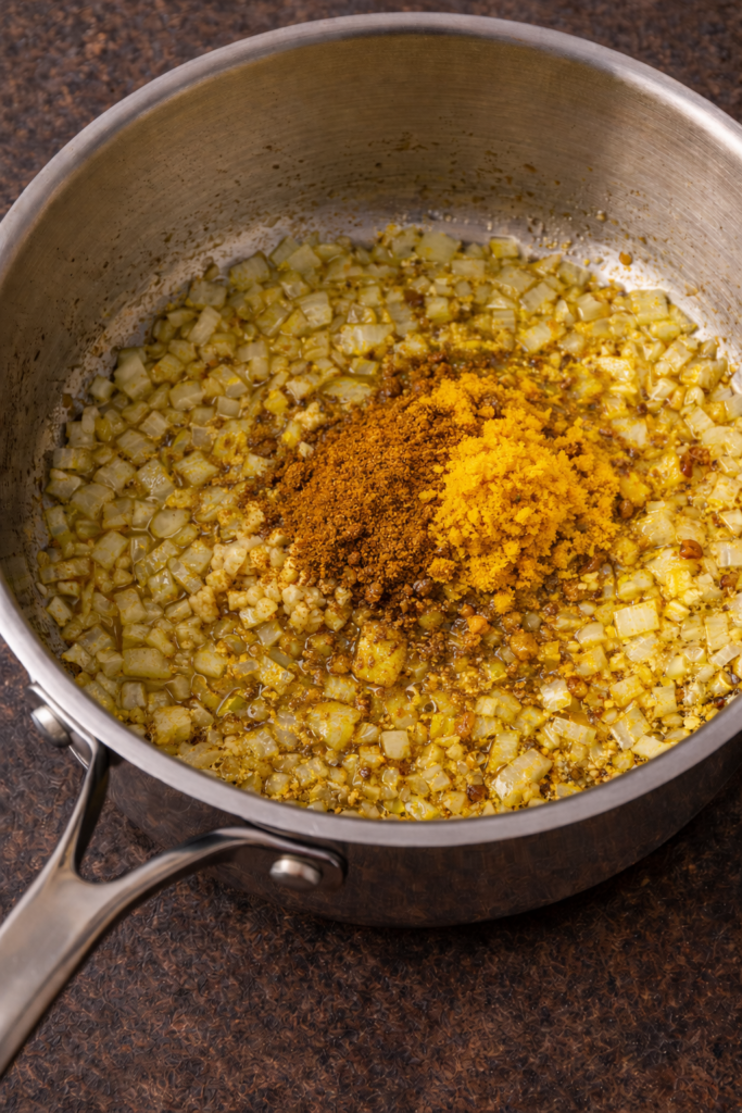 Adicione o caril em pó e a cúrcuma. Mexa bem para que as especiarias libertem os seus aromas naturais com o calor.