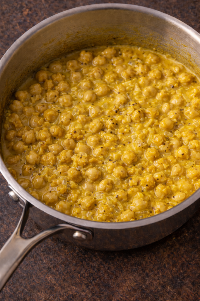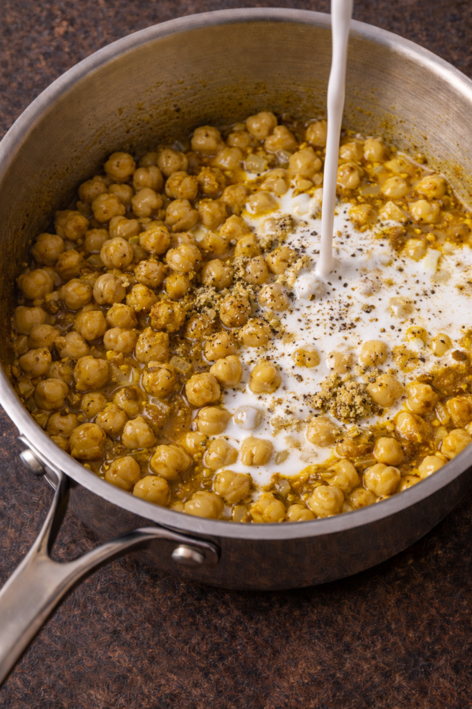 Junte o grão-de-bico escorrido e envolva bem no refogado. De seguida, verta o leite de coco. Tempere com sal e pimenta.