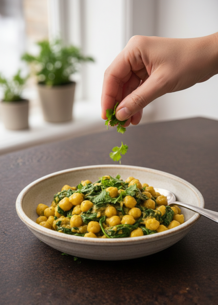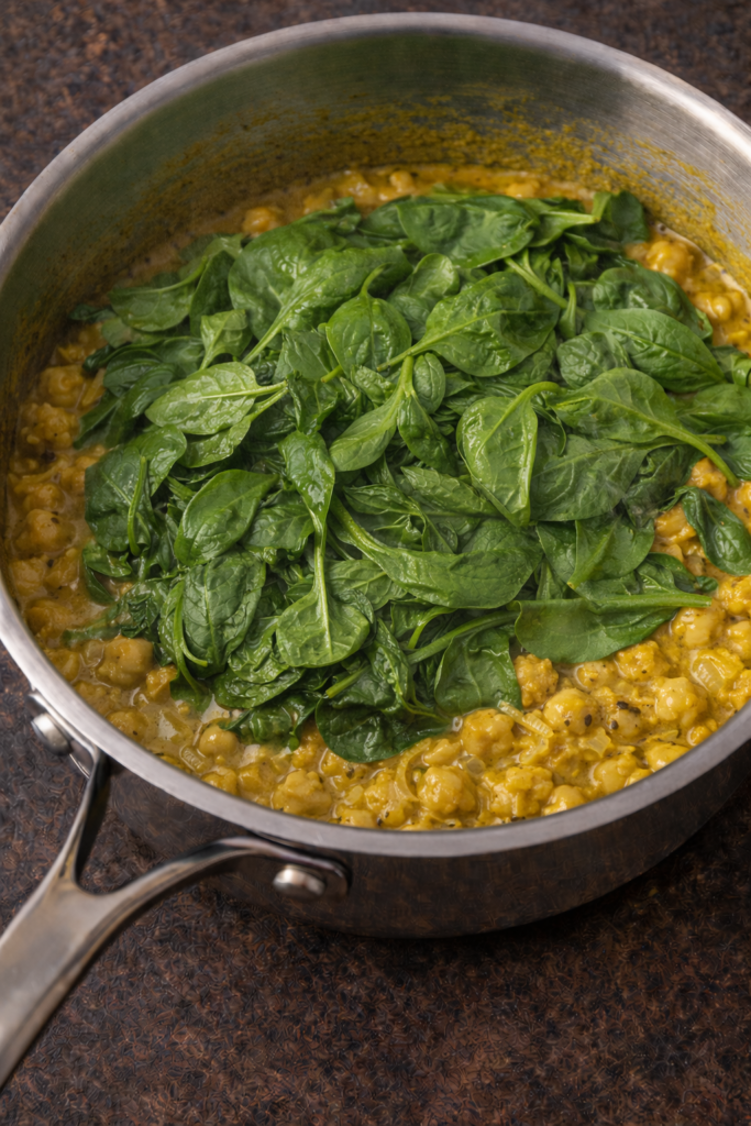 Adicione os espinafres frescos por cima. Tape a panela durante 1 minuto apenas para eles murcharem com o vapor. Mexa delicadamente.