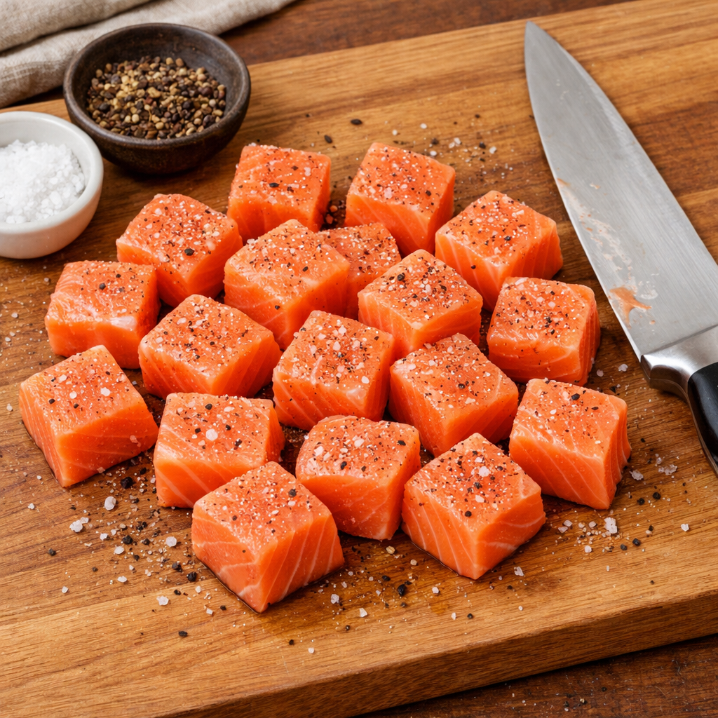 Enquanto a massa coze, corte os lombos de salmão em cubos de cerca de 2-3 cm. Tempere com sal e pimenta.