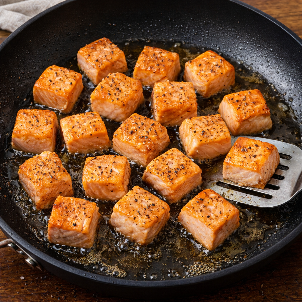 Numa frigideira em lume médio-alto, adicione o azeite. Quando estiver quente, coloque os cubos de salmão e salteie por 2-3 minutos de cada lado, até ficarem ligeiramente dourados e cozinhados (mas ainda suculentos). Retire o salmão da frigideira e reserve.