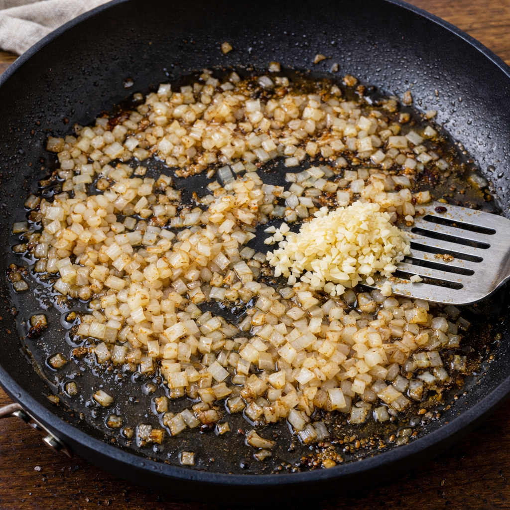 Na mesma frigideira, adicione a cebola picada e refogue em lume brando por 2-3 minutos, até ficar translúcida. Adicione o alho e refogue por mais 1 minuto.