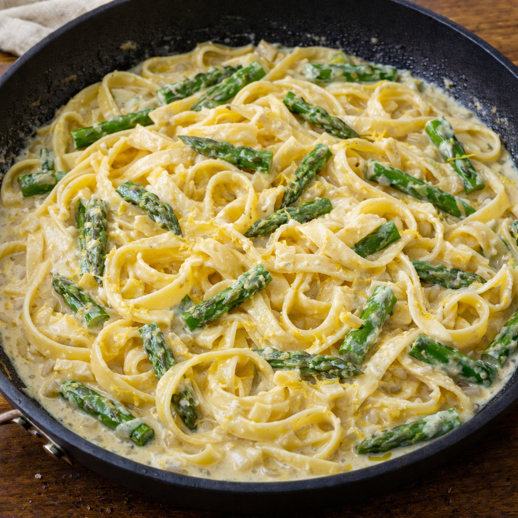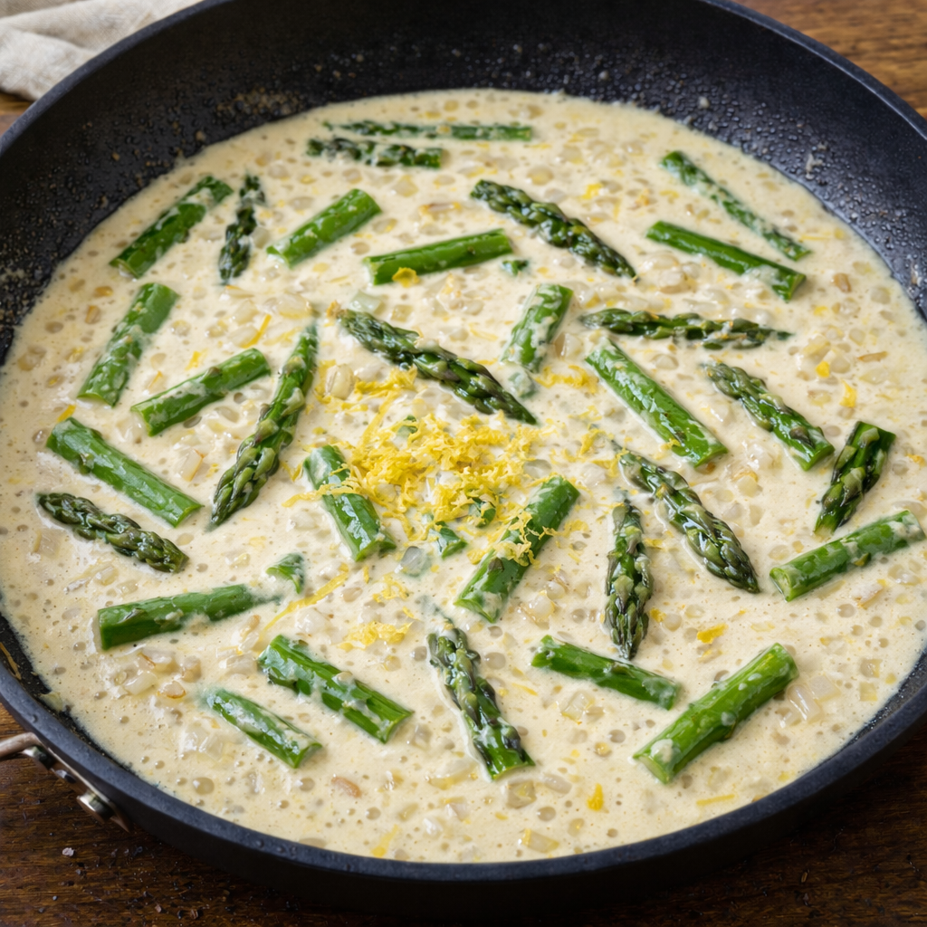 Adicione as natas, o sumo e a raspa de limão à frigideira. Deixe levantar fervura suavemente e mexa. Se usar espargos, adiciona-os agora.