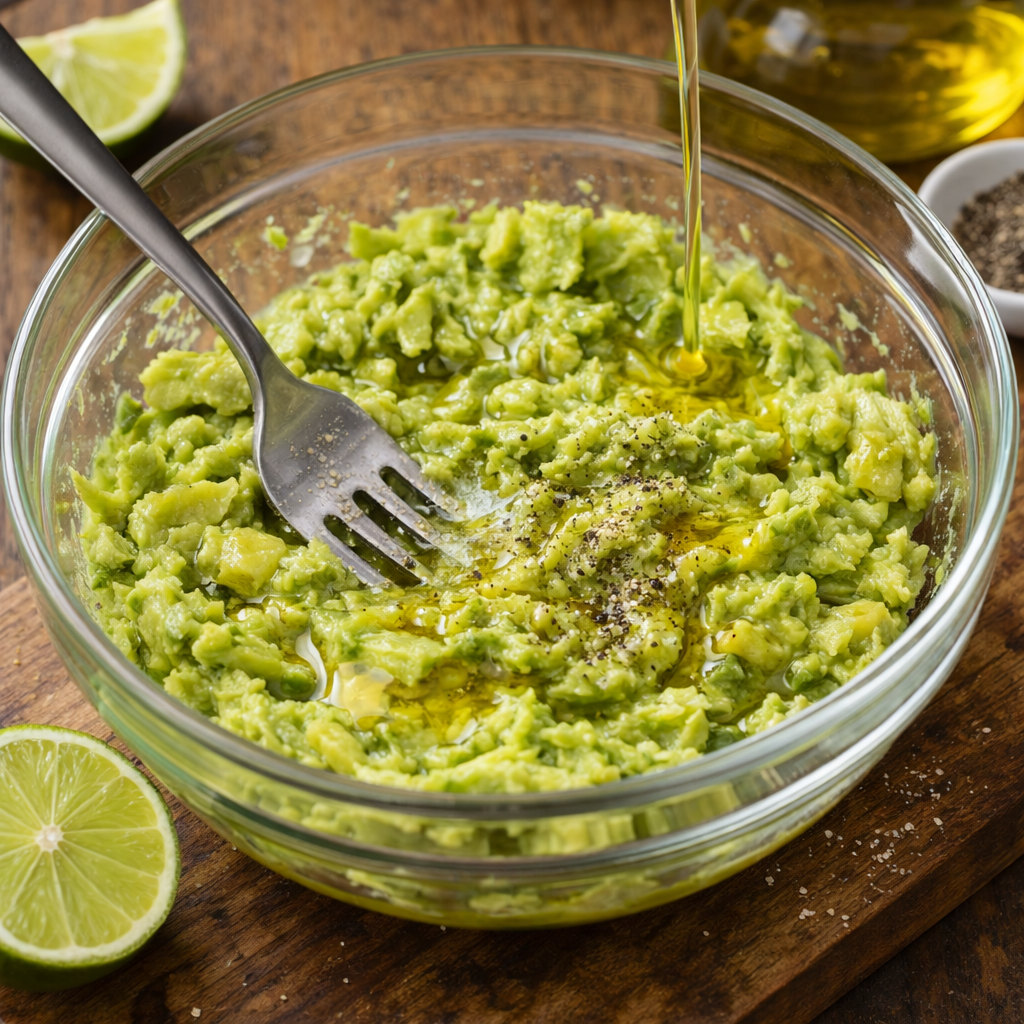 Abra o abacate, retire o caroço e coloque a polpa numa taça. Esmague com um garfo (deixe alguns pedaços para ter textura). Adicione o sumo de limão, um fio de azeite, sal e pimenta. Reserve.