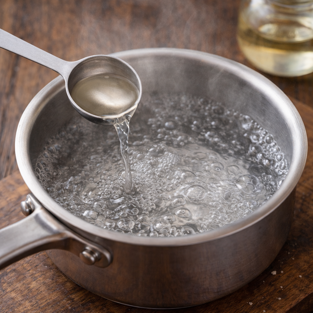 Aqueça água numa panela pequena (não deixes ferver em cachão, apenas bolhas pequenas no fundo). Adicione o vinagre.