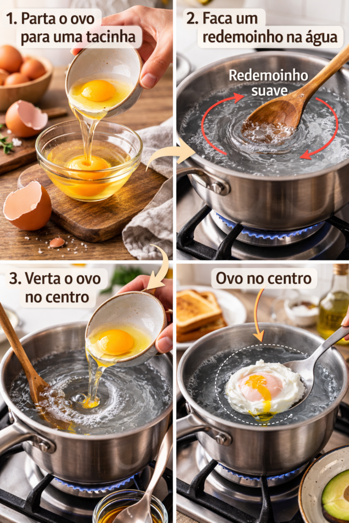 Parta um ovo para uma tacinha. Com uma colher, faça um redemoinho suave na água e verta o ovo cuidadosamente no centro.