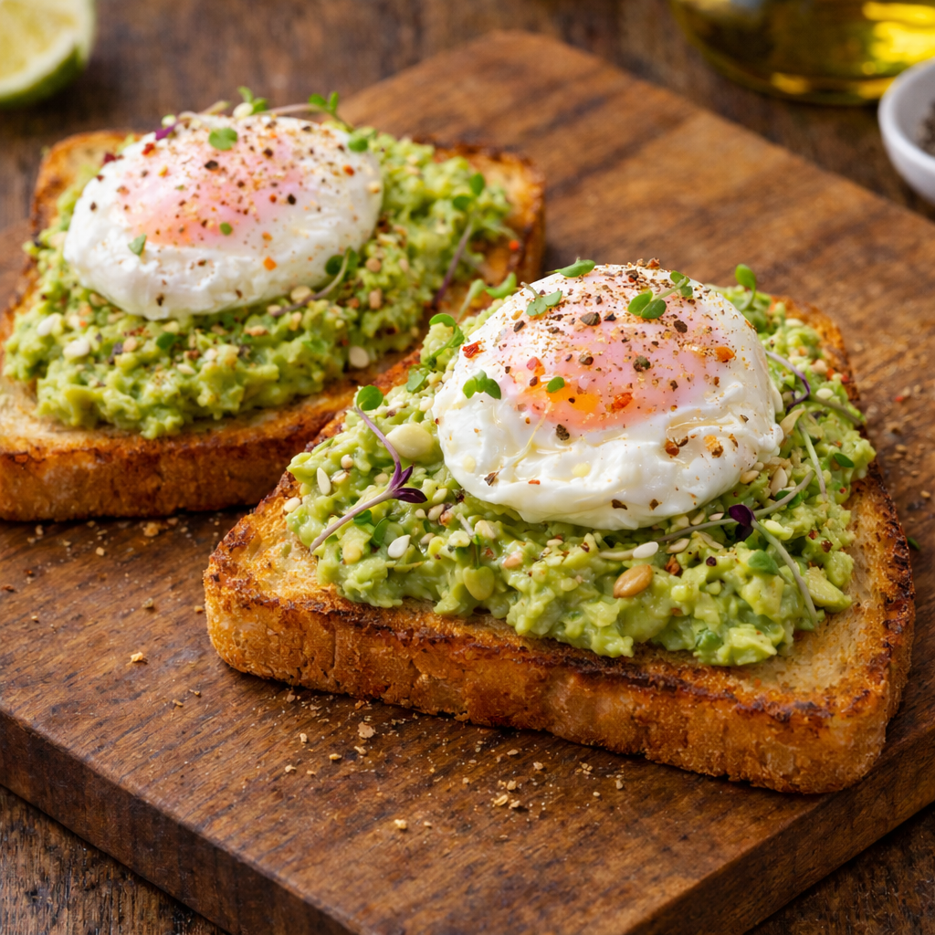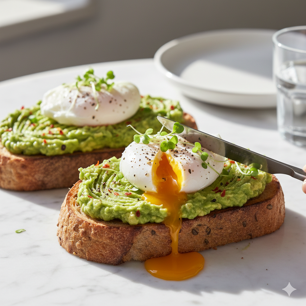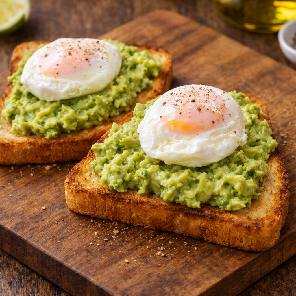 Espalhe generosamente o creme de abacate sobre as torradas. Coloque um ovo escalfado por cima de cada uma.